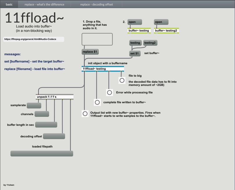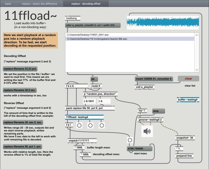 Load audio from a file into a buffer~ in a non-blocking way. Includes ffmpeg libs to support many formats. Compared to buffer~‘s own handling of files, we are not blocked until the complete file has been decoded and written to the refered buffer~. We can abort a running decode process with a new "replace" request.